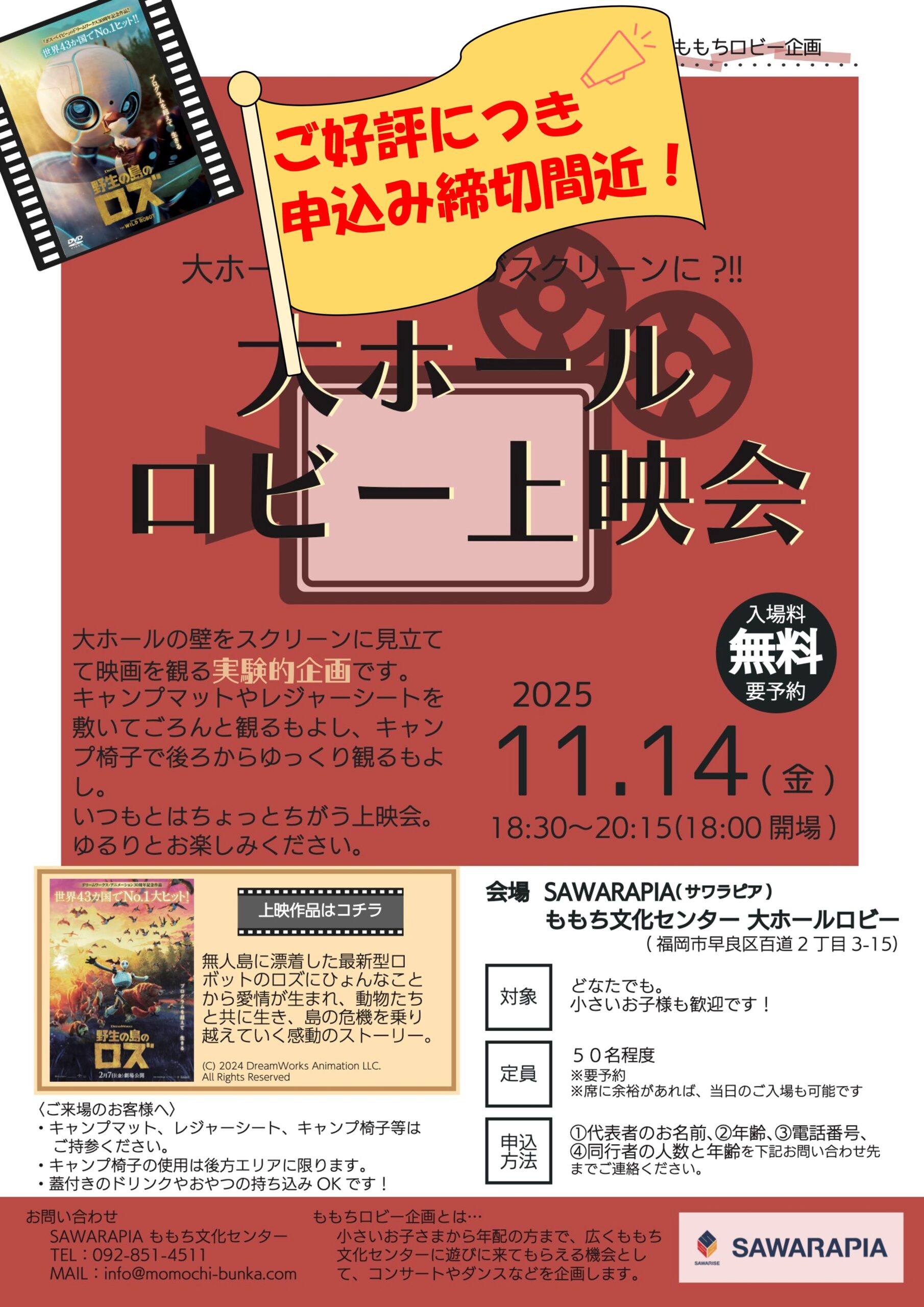 | 申込 | 事前に申込みが必要です。 ①代表者のお名前、②年齢、③電話番号、④同行者の人数と年齢を 下記お問合せ先までご連絡ください。 【お問い合わせ・申し込み】 SAWARAPIA ももち文化センター TEL 092-851-4511 MAIL info@momochi-bunka.com |