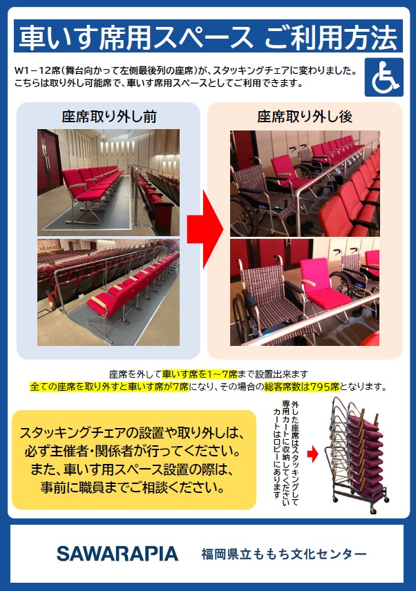 車いす席の設置は主催者・関係者でスタッキングチェアの取り外し、利用後は原状復帰をお願いします。