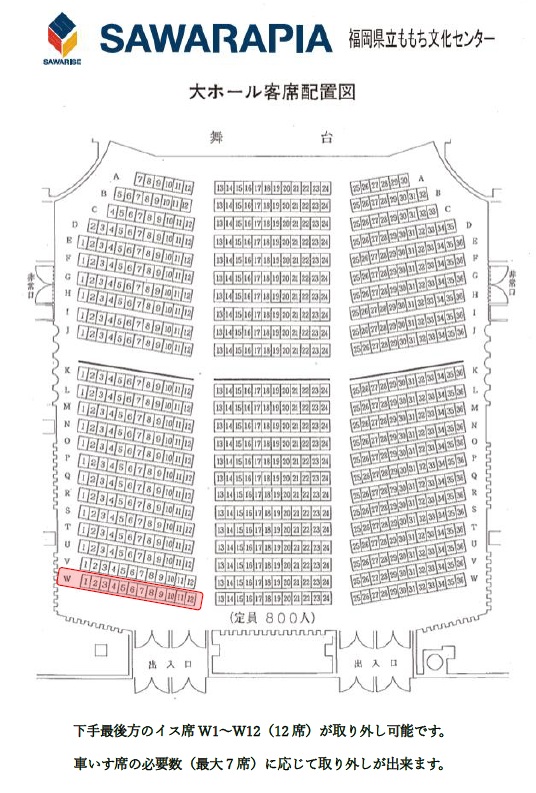 大ホール舞台に向かって左側最後方の客席W1~W12の1列 12席を取り外し可能なスタッキングチェアに変更しました。